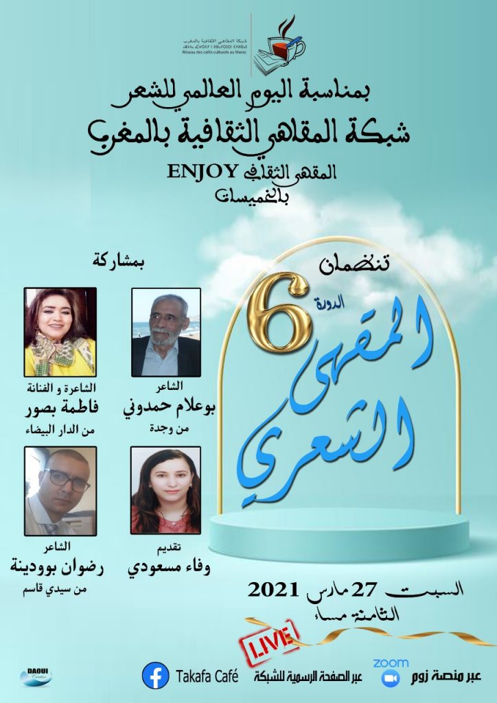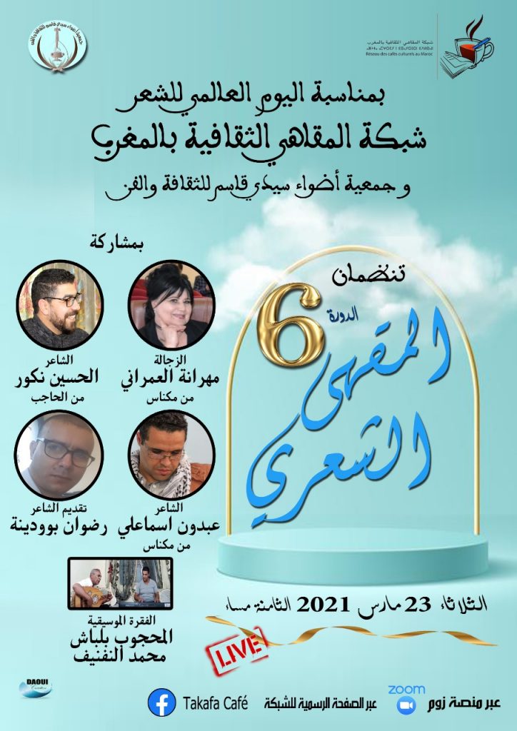 بمناسبة اليوم العالمي للشعر الذي يصادف 21 مارس من كل سنة ، تنظم شبكة المقاهي الثقافية بالمغرب النسخة السادسة من المقهى الشعري بتنسيق مع مقاه ثقافية عبر ثلاث محطات حسب البرنامج التالي :