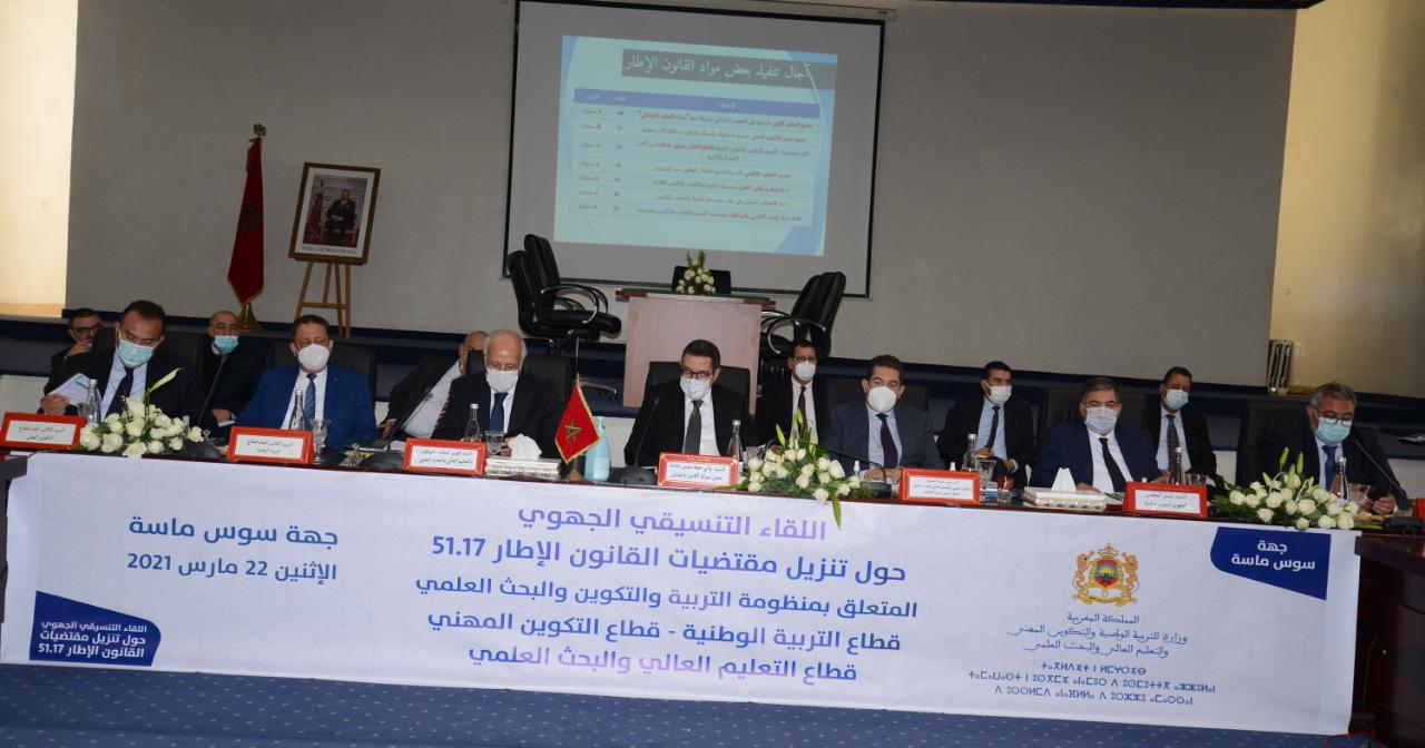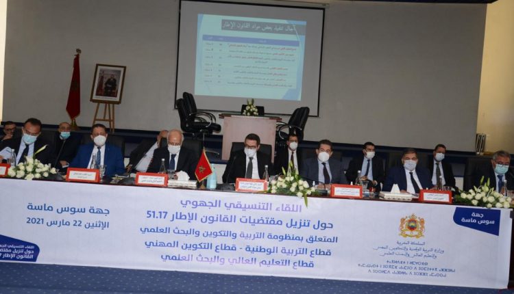 ونوه السيد الوزير خلال ترؤسه أشغال هذا اللقاء التنسيقي الجهوي، بمقر ولاية جهة سوس ماسة، بمعية السيد إدريس أوعويشة، الوزير المنتدب المكلف بالتعليم العالي والبحث العلمي، وبحضور والي جهة سوس ماسة، عامل عمالة اكادير ادوتنان، ورئيس مجلس جهة سوس ماسة وعمال صاحب الجلالة على أقاليم الجهة، بالمجهودات التي قام بها الجميع لتأمين سير الدراسة في ظروف آمنة بسبب جائحة كورونا، معتبرا بعد أن قدم ، أمام الحضور، السيرورة الاستراتيجية والتشريعية لتنزيل أحكام القانون الإطار، أن تحقيق المشروع المجتمعي لبلادنا، الذي يصبو إليه صاحب الجلالة الملك محمد السادس نصره الله وأيده، رهين بترسيخ أدوار المدرسة المغربية، ولا يتأتى ذلك إلا من خلال التملك الجماعي للمشاريع الاستراتيجية لتنزيل أحكام القانون الإطار وبتطوير آليات التدخل الميداني وتقوية قنوات التنسيق في إطار تحقيق الالتقائية بين مختلف برامج التنمية المحلية بجهة سوس ماسة مع هذه المشاريع، مجددا دعوة جميع الفاعلين والشركاء إلى مواصلة مواكبة الإصلاح التربوي لتحقيق مدرسة ترقى إلى تطلعات المجتمع المغربي، مدرسة الإنصاف والجودة والارتقاء بالفرد والمجتمع.