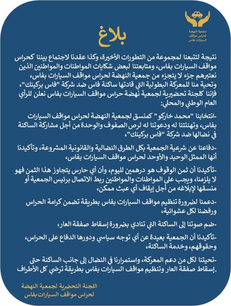 جمعية النهضة لحراس مواقف السيارات بفاس.. تصطف مع الساكنة لإسقاط “صفقة العار”