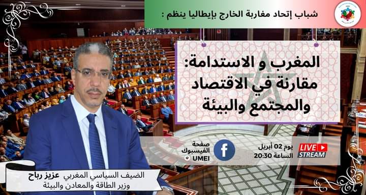 في إطار اهتمام أبناء الجالية المغربية بالتطورات الحاصلة بالمغرب؛ نظم شباب اتحاد مغاربة الخارج بإيطاليا حوارا مباشرا ” لايف ” مع وزير الطاقة والمعادن والتنمية المستدامة في الحكومة المغربية، السيد عزيز رباح، في موضوع “المغرب والاستدامة: مقارنة في الاقتصاد والمجتمع والبيئة”، وذلك يوم 2 أبريل المنصرم.