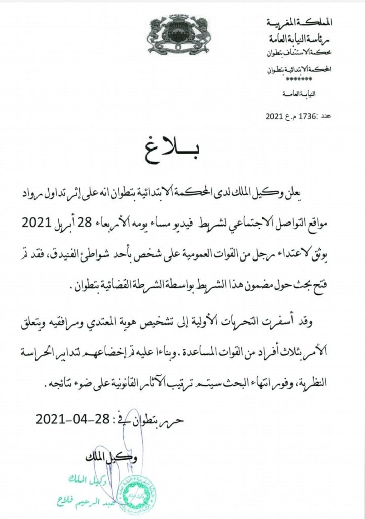 يعلن وكيل الملك لدى المحكمة الابتدائية بتطوان أنه على إثر تداول رواد مواقع التواصل الاجتماعي لشريط فيديو مساء يومه الأربعاء 28 أبريل 2021 يوثق لاعتداء رجل من القوات العمومية على شخص بأحد شواطئ الفنيدق، فقد تم فتح بحث حول مضمون هذا الشريط بواسطة الشرطة القضائية بتطوان.