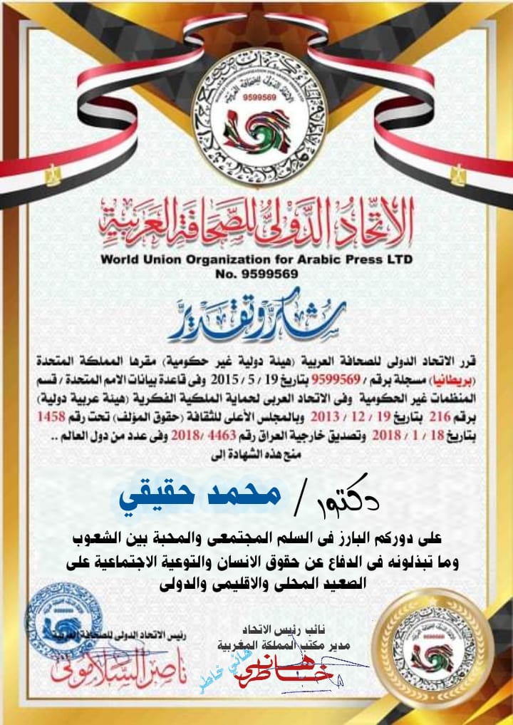 فقد توج الدكتور محمد حقيقي بشهادتي شكر وتقدير لدوره البارز فى السلم المجتمعي والمحبة بين الشعوب والعمل الحقوقي على الصعيد المحلى المغربي والإقليمي والدولي .