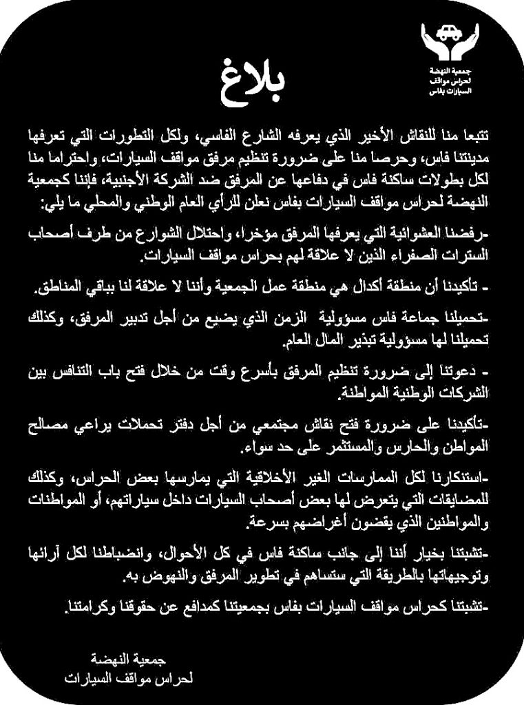 واختتمت الجمعية البلاغ، باستنكارها كل الممارسات غير الأخلاقية، التي يمارسها بعض الحراس، والمضايقات التي يتعرض أصحاب السيارات في المواقف، مشيرة إلى تشبتها بخيار أنها بجانب ساكنة فاس ومنضبطة بتوجيهاتها للنهوض بالمرفق، كما شددت على تشبتها بكونها مدافعة عن حقوق وكرامة حراس المواقف.
