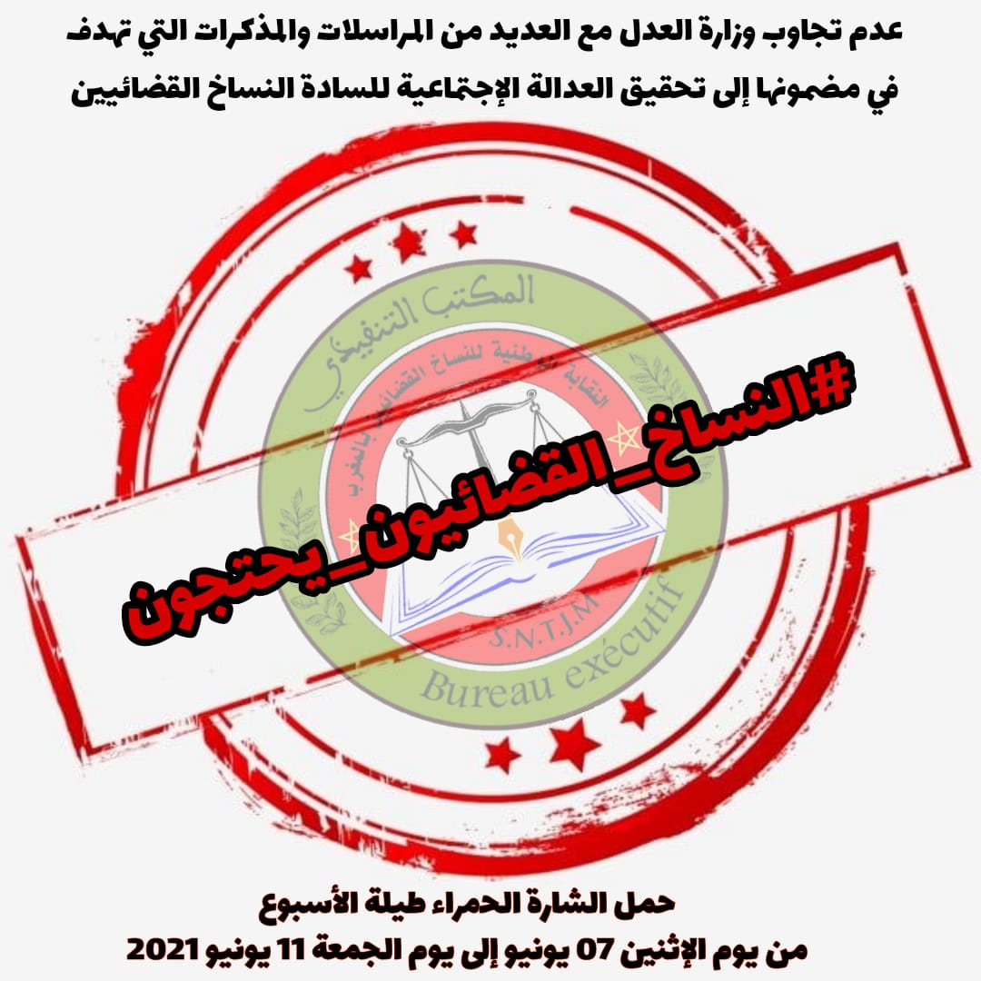 - دعوة السادة النساخ القضائيين إلى حمل الشارات الحمراء طيلة الأسبوع القادم – من يوم الإثنين 07 يونيو إلى يوم الجمعة 11 يونيو 2021 تعبيرا عن التدمر الذي يشعرون به جراء هذا التماطل المقصود في تنزيل الإصلاح المرتقب وكذا التجاهل الحاصل في الإستجابة للملف المطلبي الإجتماعي.