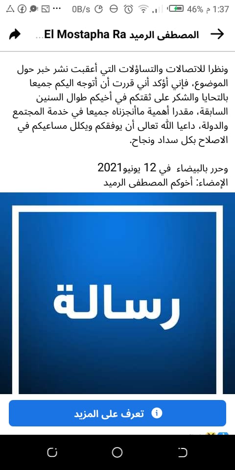 وأضاف القيادي في حزب العدالة والتنمية: “نظرا للإتصالات والتساؤلات التي أعقبت نشر خبر حول موضوع الإستقالة فإني أؤكد أني قررت أن أتوجه إليكم جميعا بالتحايا والشكر على ثقتكم في أخيكم طوال السنين السابقة، مقدرا أهمية ما أنجزناه جميعا في خدمة الدولة، وداعيا الله تعالى أن يوفقكم ويكلل مسا عيكم في الإصلاح بكل سداد ونجاح”.