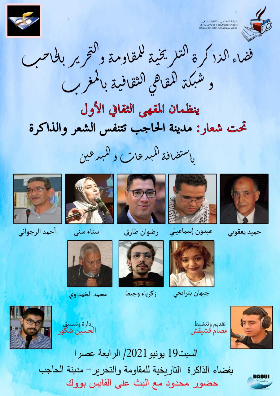 في إطار إستراتيجيتها الثقافية لهذه السنة ، وتنفيذا لقرارات جهازها الوطني بتأسيس لبنات ثقافية بعدة مدن مغربية ، ستنظم شبكة المقاهي الثقافية بالمغرب ، وفضاء الذاكرة التاريخية للمقاومة والتحرير بمدينة الحاحب ، المقهى الثقافي الأول تحت شعار ” مدينة الحاجب تتنفس الشعر والذاكرة ” وذلك يوم السبت 19 يونيو 2021 إبتداء من الساعة الرابعة عصرا بفضاء الذاكرة التاريخية للمقاومة والتحرير بمدينة الحاجب.