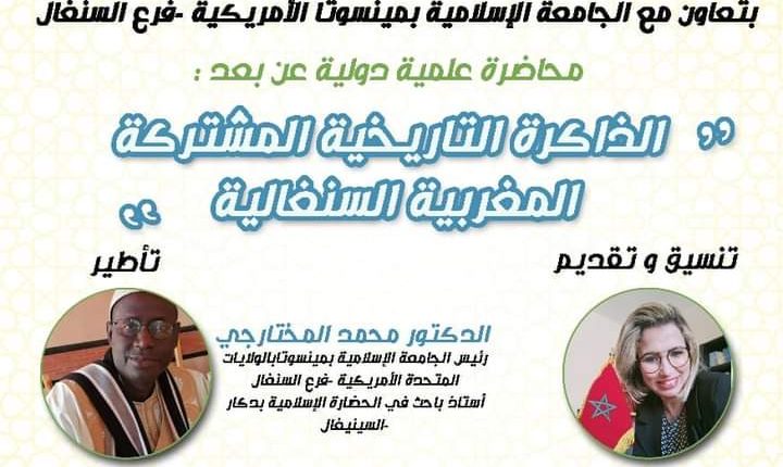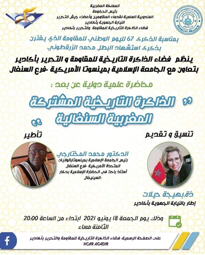 بمناسبة الذكرى 67 لليوم الوطني للمقاومة الذي يقترن بذكرى استشهاد البطل الشهيد محمد الزرقطوني والذكرى 65 للوقفة التاريخية لجلالة المغفور له محمد الخامس طيب الله ثراه، تنظم النيابة الجهوية للمندوبية السامية لقدماء المقاومين وأعضاء جيش التحرير باكادير وفضاء الذاكرة التاريخية للمقاومة والتحرير بأكادير بتعاون مع الجامعة الإسلامية بمينسوتا الولايات المتحدة الأمريكية- فرع السنغال، محاضرة علمية دولية عن بعد في موضوع: “الذاكرة التاريخية المشتركة المغربية السنغالية” من تأطير: الدكتور محمد المختارجي رئيس الجامعة الإسلامية بمينسوتا بالولايات المتحدة الأمريكية- فرع السنغال. وهو محاضر دولي معروف، وأستاذ باحث في الحضارة الإسلامية بالمعهد الإسلامي بدكار- السنغال، ورئيس الرابطة العربية الإفريقية بالسويد، وعضو بمجموعة من المنظمات الثقافية الدولية بالسنغال والمغرب والسويد والعراق وبيروت ومصر وفلسطين والجزائر، وتونس والإمارات العربية المتحدة. ومن تقديم السيدة بهيجة حيلات باحثة في التراث الثقافي وإطار بالنيابة الجهوية بأكادير، وذلك يوم الجمعة 18 يونيو 2021 ابتداء من الساعة الثامنة مساء، على الصفحة الرسمية للنيابة الجهوية على الفايس بوك: فضاء الذاكرة التاريخية للمقاومة والتحرير بأكادير