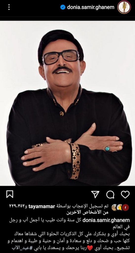و نشرت دنيا صورة لوالدها عبر حسابها الشخصي على موقع “إنستغرام” و كتبت: “كل سنة و أنت طيب يا أجمل أب و رجل في العالم .. بحبك أوي و بشكرك على كل الذكريات الحلوة اللي شفناها معاك .. كلها حب و ضحك و دلع و سعادة و حنية و طيبة و اهتمام و تشجيع.. بحبك أوي ربنا يرحمك ويسعدك يا بابي”.