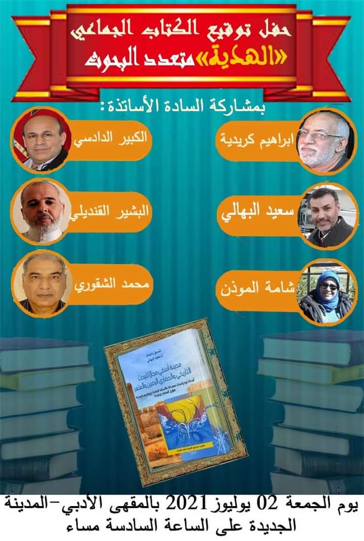 ينظم المقهى الأدبي بأسفي بتنسيق مع شبكة المقاهي الثقافية بالمغرب حفل توقيع الكتاب الجماعي ” الهدية ” الموسوم بعنوان ” مدينة أسفي مجالا للبحث التاريخي والحضاري الرصين والمثمر ” من تنسيق وإعداد الأستاذ سعيد البهالي بمشاركة الأساتذة إبراهيم كريدية والكبير الدادسي والبشير القنديلي ومحمد الشقوري وشانة الموذن ومحمد الشقوري وذلك يوم الجمعة 2 يوليوز 2021 على الساعة السادسة مساء بالمقهى الأدبي المدينة الجديدة بأسفي.