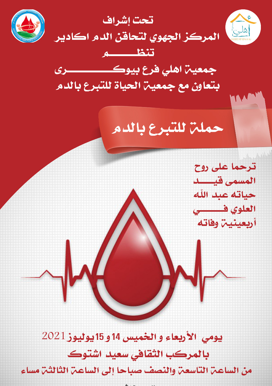تحت إشراف المركز الجهوي لتحاقن الدم أكادير؛ تعتزم جمعية أهلي فرع بيوكرى بتعاون مع جمعية الحياة للتبرع بالدم، حملة للتبرع بالدم، ترحما على روح المسمى قيد حياته عبد الله العلوي، في أربعينية وفاته أيام 14/15 يوليوز الجاري، بالمركب الثقافي سعيد اشتوك، من الساعة التاسعة والنصف صباحا الى الثالثة مساءاً.