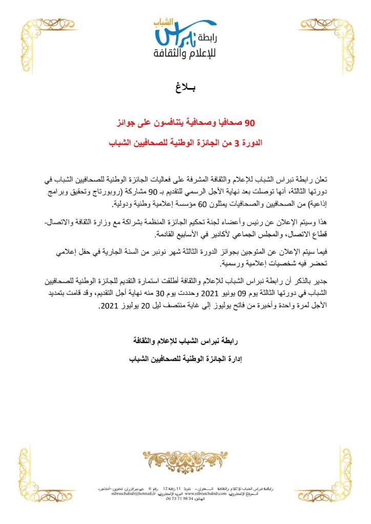 تعلن رابطة نبراس الشباب للإعلام والثقافة المشرفة على فعاليات الجائزة الوطنية للصحافيين الشباب في دورتها الثالثة، أنها توصلت بعد نهاية الأجل الرسمي للتقديم بـ 90 مشاركة (روبورتاج وتحقيق وبرامج إذاعية( من الصحافيين والصحافيات يمثلون 60 مؤسسة إعلامية وطنية ودولية.