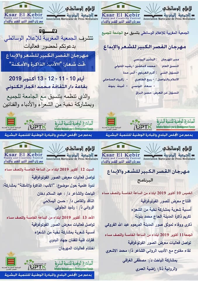 تعيش مدينة القصر الكبير ابتداء من هذا اليوم الخميس 10 أكتوبر 2019 وإلى غاية 13 منه، مهرجانا للشعر والإبداع تحت شعار : ” الأدب: الذاكرة والأمكنة “، وذلك بفضاء دار الثقافة محمد الخمار الكنوني، انطلاقا من الخامسة والنصف مساء.