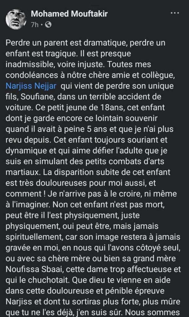 وقد أعلن هذا الخبر المخرج المغربي محمد مفتكر بتدوينة له عبر وسائل التواصل الاجتماعي وهي كتالي“كل التعازي لصديقتنا وزميلتي العزيزة، نرجس نجار التي فقدت للتو ابنها الوحيد، سفيان، في حادث سيارة مروع”.