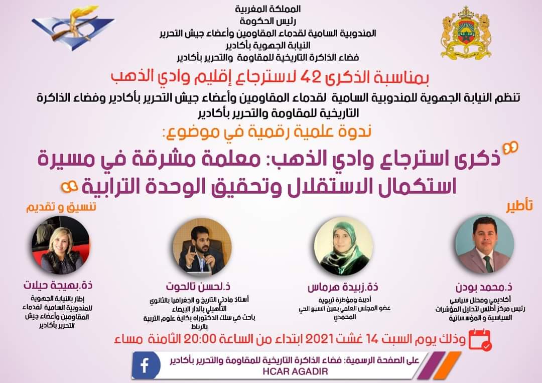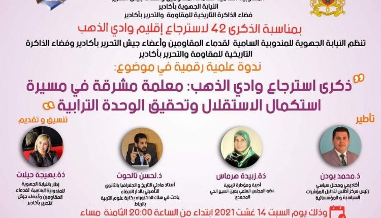 احتفالا بالذكرى 42 لاسترجاع إقليم وادي الذهب تنظم النيابة الجهوية للمندوبية السامية لقدماء المقاومين وأعضاء جيش التحرير بأكادير وفضاء الذاكرة التاريخية للمقاومة والتحرير بأكادير ندوة فكرية وطنية في موضوع: “ذكرى استرجاع وادي الذهب: معلمة مشرقة في مسيرة استكمال الاستقلال وتحقيق الوحدة الترابية”.