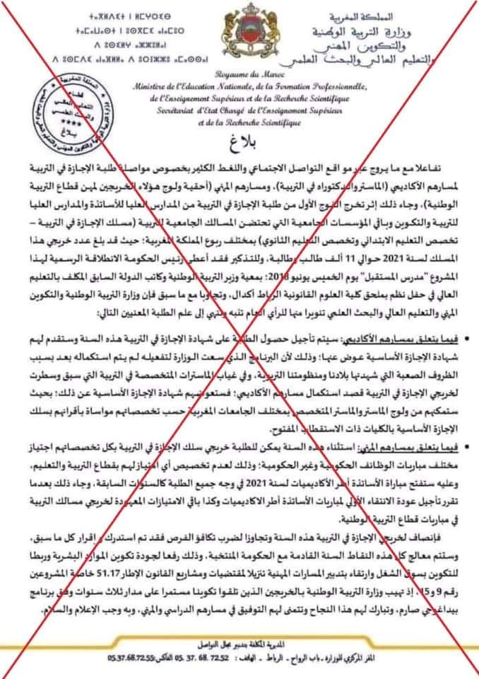 على إثر تداول بلاغ صحفي مفبرك بشأن خريجي الإجازة في التربية، فإن وزارة التربية الوطنية والتكوين المهني والتعليم العالي والبحث العلمي تنويرا منها للرأي العام الوطني تنفي نفيا قاطعا ما جاء في هذا البلاغ من معطيات لا أساس من الصحة.