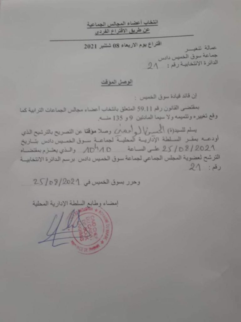 قام الحسين الوحماني، بوضع ترشحه، رسميا، عن حزب الإستقلال، بالدائرة الإنتخابية 21 على مستوى جماعة سوق الخميس بإقليم تنغير، للمنافسة في الإستحقاقات الجماعية لـ 8 شتنبر المقبل.