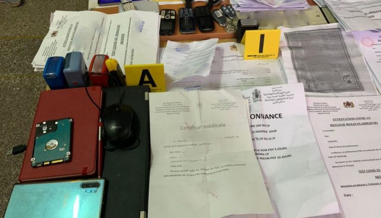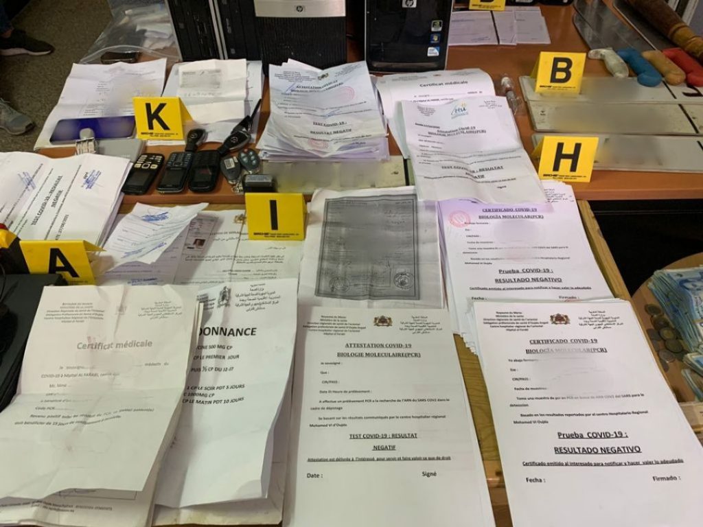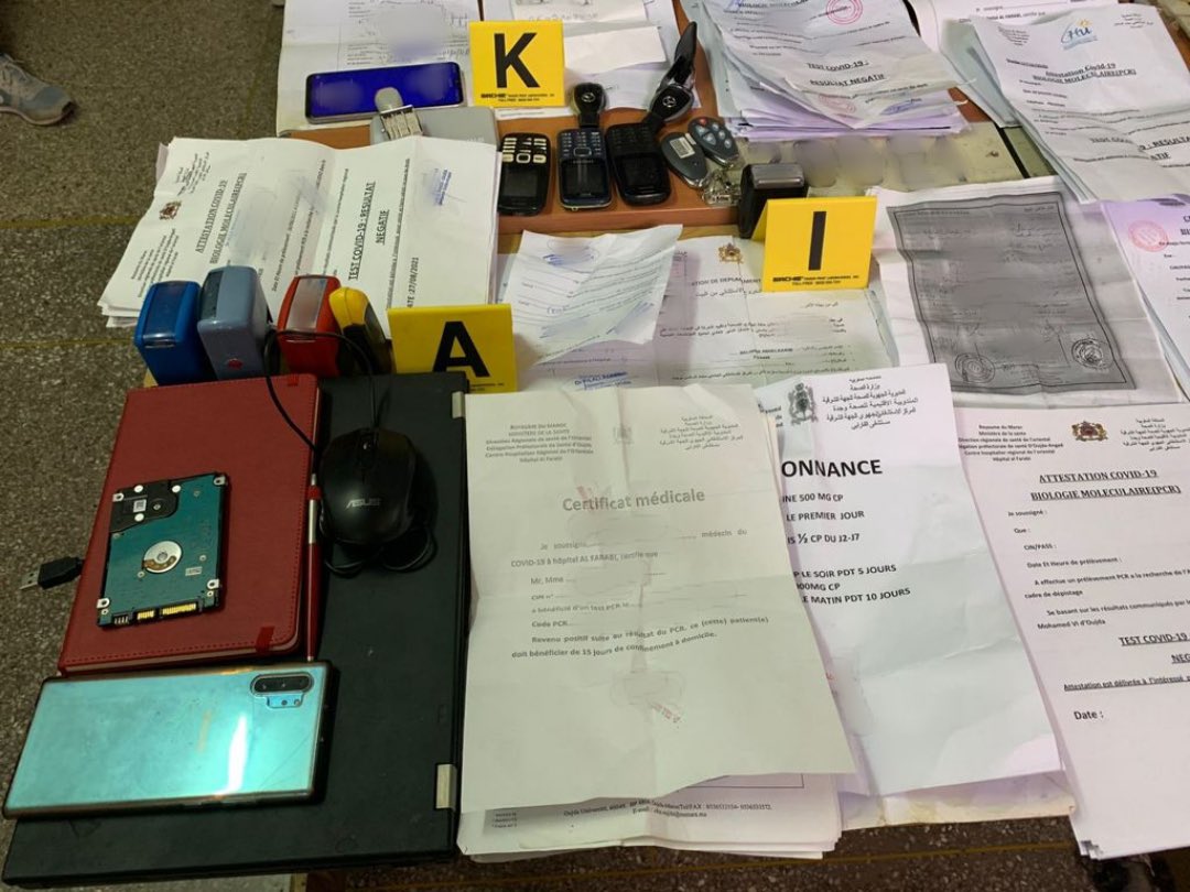 وأضاف البلاغ أن عمليات التفتيش المنجزة بمنازل المشتبه فيهم بمدينة وجدة أسفرت عن ضبط العشرات من شواهد الاختبارات المزورة للكشف عن وباء كوفيد-19، منها مطبوعات فارغة وأخرى تتضمن نتائج سلبية مزورة، ومعدات معلوماتية ودعامات رقمية، ومبالغ مالية بالعملة الوطنية تتجاوز 875 ألف درهم وأخرى بالعملة الأوروبية، فضلا عن طابع يحمل صفة طبيب في مستشفى جامعي، علاوة على خمس أسلحة بيضاء وسيارة وأربع صفائح معدنية للسيارات مشكوك فيها.