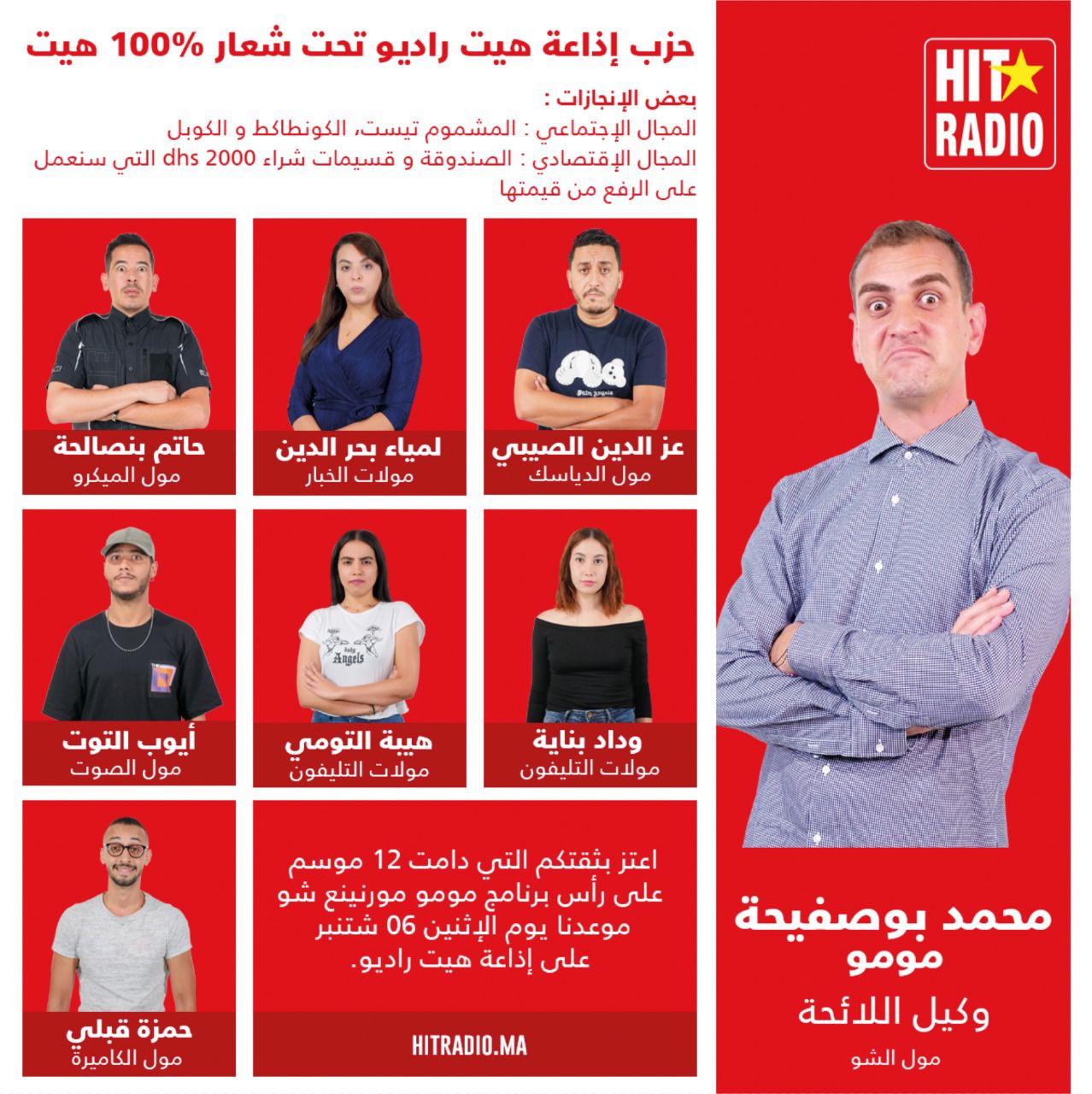 تحت شعار” 100 في المائة هيت، ومن باب النشاط وشكون للي كي فيقكم كل صباح”، ومن خلال برنامج “ترويجي قوي” قرر المنشط الإذاعي محمد بوصفيحة، المعروف ب “مومو”، الإعلان عن انطلاق الموسم المقبل من البرنامج الصباحي الأول في المغرب ” مومو مورننيغ شو” على إذاعة هيت راديو، بأسلوب يواكب الاستحقاقات المقبلة ببلادنا، حيث اختار الترويج للموسم الجديد الذي سينطلق يوم الاثنين 6 شتنبر المقبل ابتداء من الساعة السابعة صباحا، على طريقة الحملات الانتخابية.