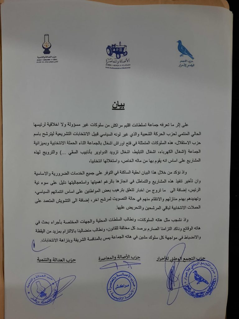 وجاء في البيان الذي وقعه كل من حزب التجمع الوطني للأحرار وحزب الأصالة والمعاصرة وحزب العدالة والتنمية، أنه “على إثر ما تعرفه جماعة تاسلطانت إقليم مراكش، من سلوكات غير مسؤولة ولا أخلاقية لرئيسها الحالي المنتمي لحزب الحركة الشعبية والذي غير لونه السياسي قبيل الانتخابات التشريعية، ليترشح باسم حزب الاستقلال”.
