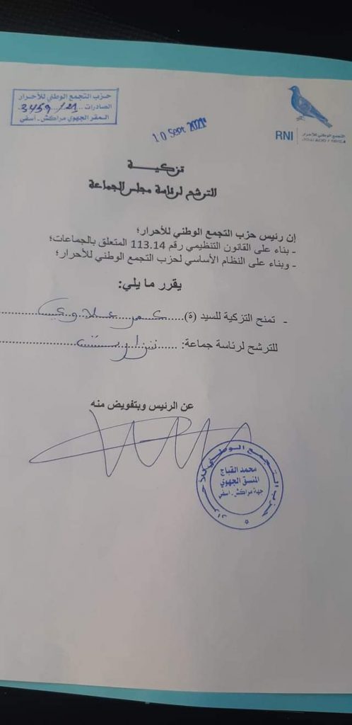 حزب التجمع الوطني للأحرار يمنح عمر علاوي تزكية الترشح لرئاسة جماعة تزارت