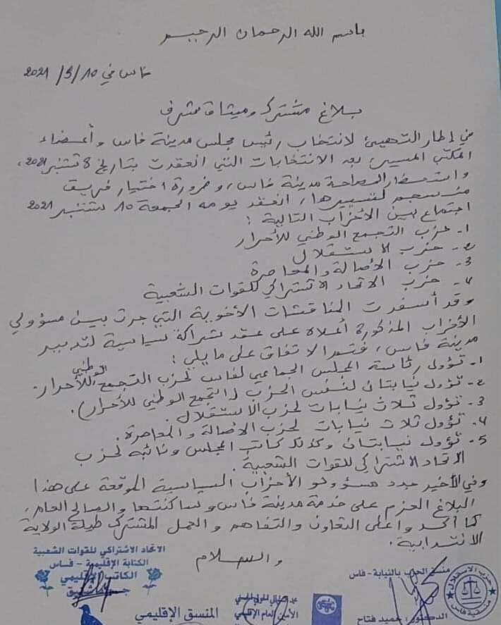 تم اليوم 11 شتنير بمدينة فاس إعلان النتائج النهائية لانتخاب أعضاء المجلس الجماعي للعاصمة العلمية، حيث وقَّعَ أعضاء ينتمون إلى أحزاب التجمع الوطني للأحرار، والاستقلال، والأصالة والمعاصرة والاتحاد الاشتراكي للقوات الشعبية، ميثاق شرف يؤكد تحالف هذه التنظيمات السياسية لتشكيل مكتب المجلس الجماعي وكافة أجهزته.