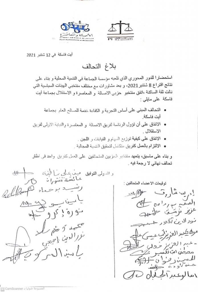 بناءً على نتائج انتخابات الثامن من شتنبر الجاري، وفي سياق مسلسل التحالفات بين القوى السياسية لتدبير الشأن العام والمحلي على حد سواء، اتفق منتخبو حزبي الأصالة والمعاصرة والإستقلال بجماعة آيت فاسكا على التحالف بين الهيئتين “خدمة للصالح العام”.
