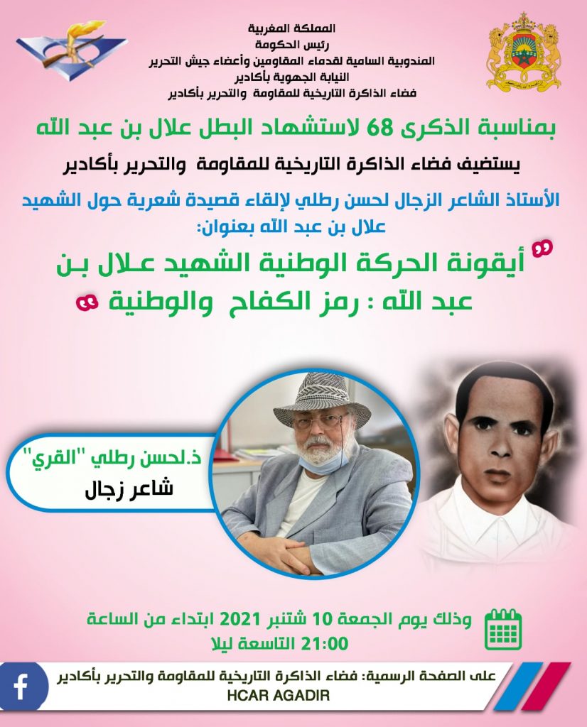 احتفاء بالذكرى 68 لاستشهاد البطل علال بن عبد الله وفي إطار الأنشطة العلمية الرقمية المنظمة بالمناسبة استضاف فضاء الذاكرة التاريخية للمقاومة والتحرير بأكادير الشاعر الزجال الأستاذ لحسن رطلي لإلقاء قصيدة شعرية عن بعد بعنوان”أيقونة الحركة الوطنية علال بن عبد الله الشهيد: رمز الكفاح والتضحية”، وذلك يوم الجمعة 10 شتنبر 2021 ابتداء من الساعة السادسة 20:00 مساء.