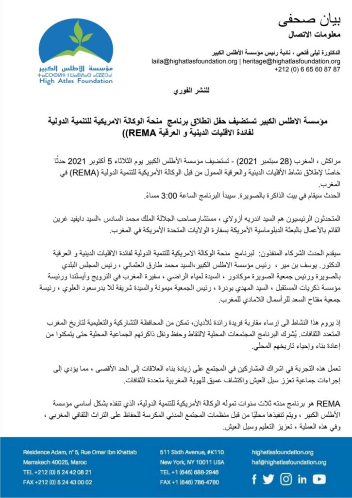 تستضيف مؤسسة الأطلس الكبير يوم الثلاثاء الموافق ل5 أكتوبر 2021 حدث إطلاق نشاط الأقليات الدينية والعرقية الممول من قبل الوكالة الأمريكية للتنمية الدولية REMA في المغرب وذلك في “بيت الذاكرة ” بمدينة الصويرة.