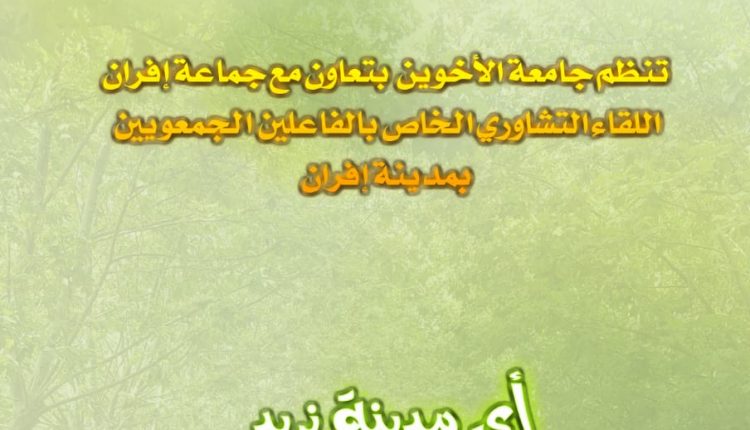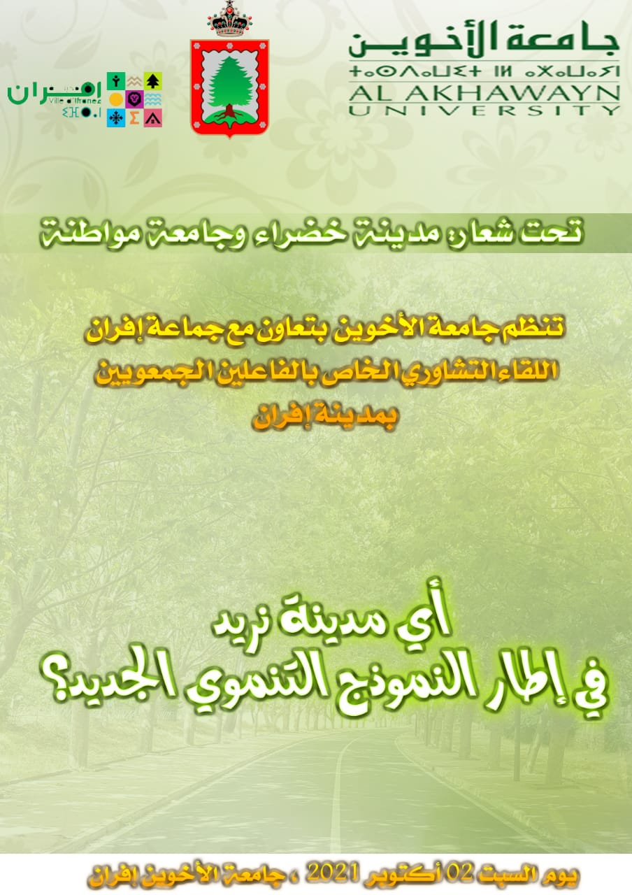 تحت شعار: “مدينة خضراء وجامعة مواطنة”، تنظم جامعة الأخوين بتعاون مع الجماعة الترابية إفران، اللقاء التشاوري الخاص بالفاعلين الجمعويين بمدينة إفران، وذلك لأجل الإجابة عن السؤال التالي: “أي مدينة نريد في إطار النم