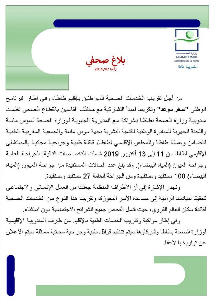 القافلة التي نظمتها مندوبية وزارة الصحة بشراكة مع المديرية الجهوية لوزارة الصحة بجهة سوس ماسة واللجنة الجهوية للمبادرة الوطنية للتنمية البشرية بذات الجهة، والجمعية المغربية الطبية للتضامن بالإضافة الى عمالة والمجلس الاقليمي لطاطا، -القافلة- عرفت اقبالا واسعا في تخصص جراحة العيون والجراحة العامة.