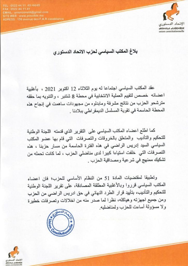 وتطبيقا لمقتضيات المادة 51 من النظام الأساسي للحزب؛ فان اعضاء المكتب السياسي قرروا وبالأغلبية المطلقة المصادقة، على تقرير اللجنة الوطنية للتحكيم والتأديب، بتأييد قرار الطرد النهائي في حق ادريس الراضي من الحزب ومن جميع اجهزته وهياكله، نظرا لما صدر منه من اخلالات وتصرفات خطيرة ولا مسؤولة أساءت للحزب ولمناضليه.