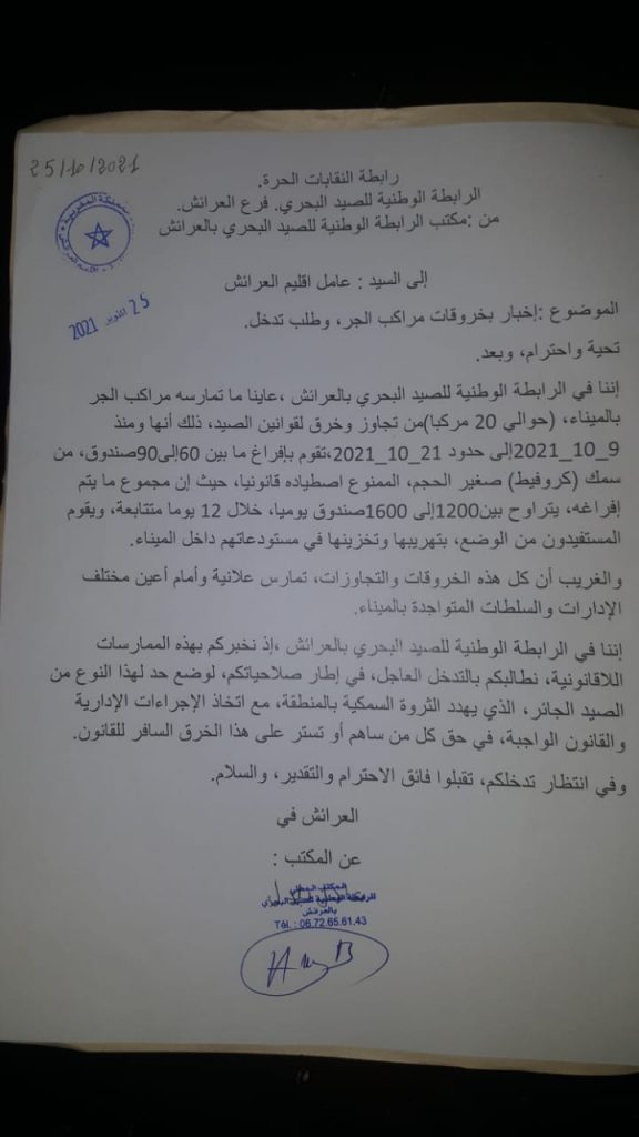 ما دفع الرابطة الوطنية للصيد البحري فرع العرائش، إلى مراسلة السيد عامل الإقليم من أجل التدخل لوقف نزيف الخروقات التي تقوم بها مراكب بحرية من استغلال وصيد غير قانوني لصغار الجمبري.