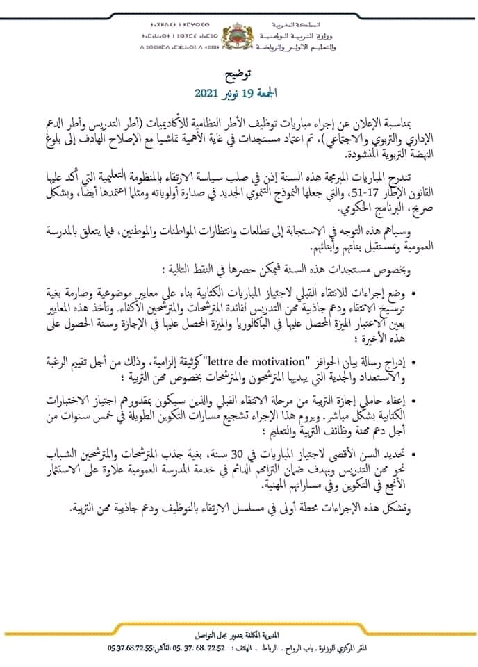 أثار قرار وزارة التربية الوطنية تحديد سن الثلاثين لمباريات التعليم استهجان الشباب فوق الثلاثين، إضافة إلى عدد كبير من رواد التواصل الإجتماعي، الذين اعتبروا أن القرار ظالم وفيه إقصاء وتبخيس للكفاءة، كون الأداء لايكون مرتبطا بالسن، لأن الكثيرين يفضلون إتمام دراساتهم قبل التقدم للوظيفة.