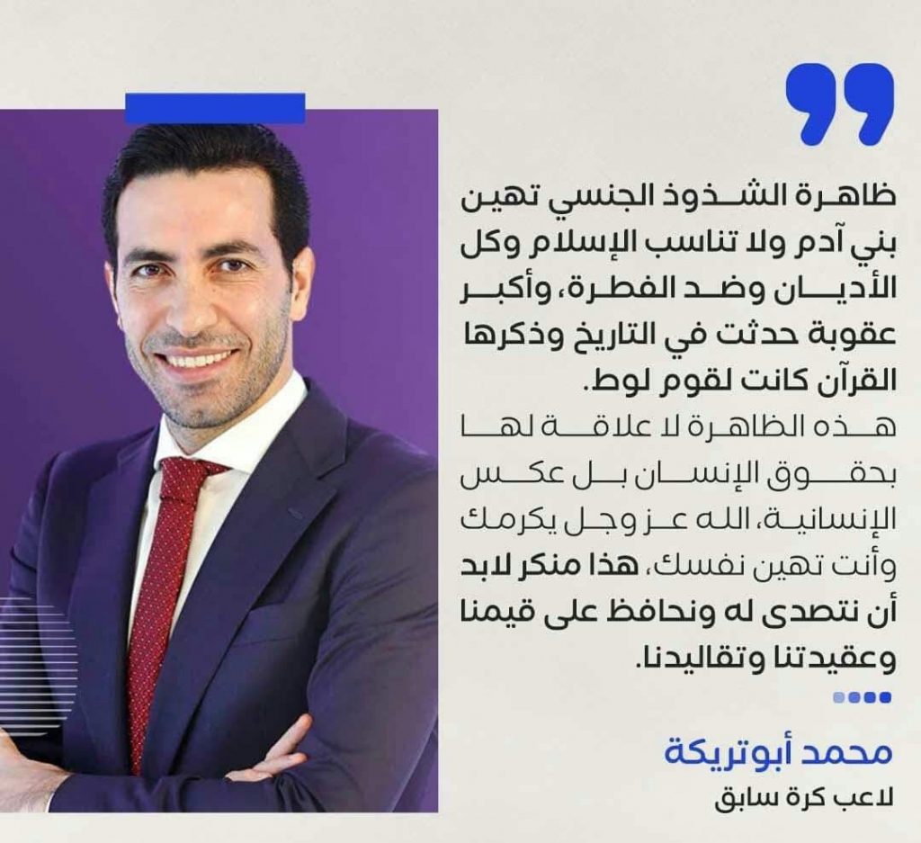 أثارت تصريحات نجم النادي الأهلي والمنتخب المصري السابق محمد أبوتريكة جدلا واسعا، بعد تصريحاته حول الدوري الإنجليزي الممتاز، الذي دعا إلى حمل شارات بألوان قوس قزح لدعم المثلية الجنسية.
