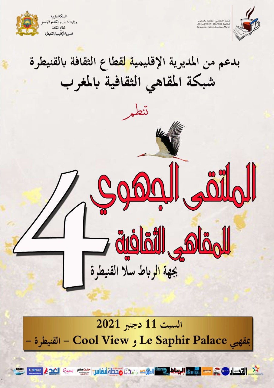تنظم شبكة المقاهي الثقافية بالمغرب الملتقى الجهوي الرابع للمقاهي الثقافية بجهة الرباط سلا القنيطرة يوم السبت 11 دجنبر 2021، بمدينة القنيطرة، وذلك بدعم من المديرية الإقليمية لقطاع الثقافة بالقنيطرة.