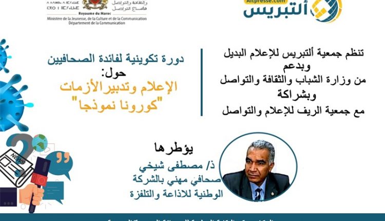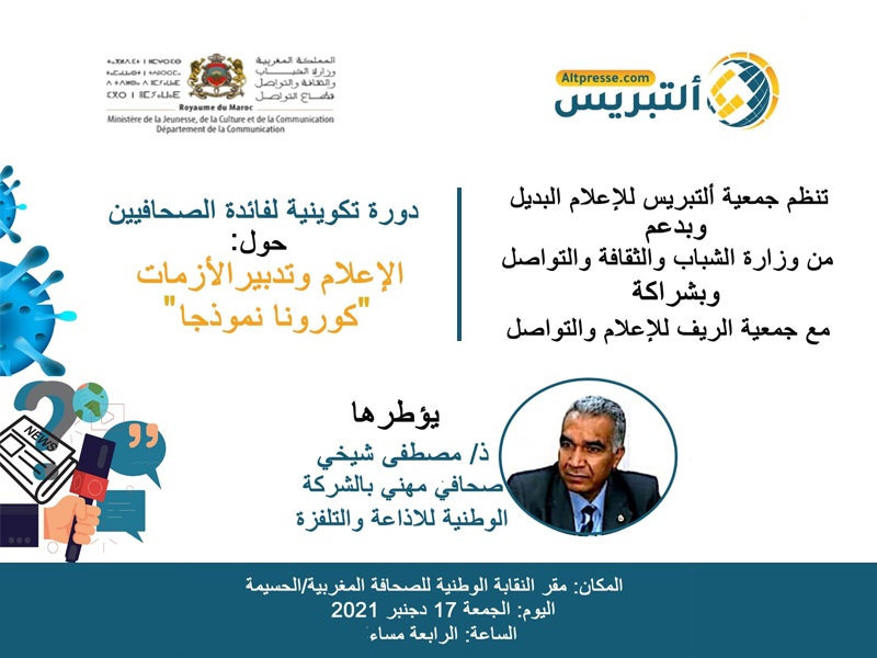 من المرتقب أن تحتضن مدينة الحسيمة يوم الجمعة 17 دحنبر 2021 دورة تكوينية حول موضوع “الإعلام وإدارة الأزمات: كورونا نموذجا” من تنظيم جمعية التبريس للإعلام البديل وبدعم من وزارة الشباب والثقافة والتواصل وبشراكة مع جمعية الريف للإعلام والتواصل.