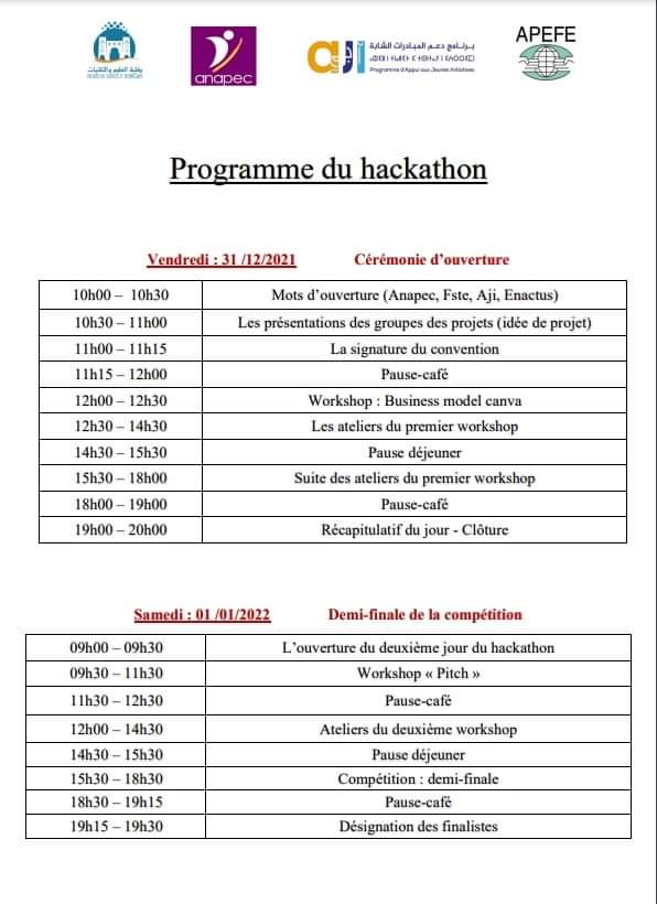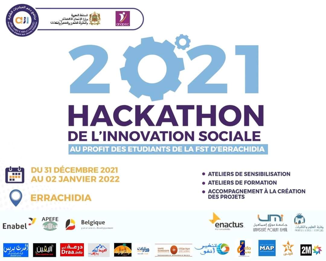 في إطار برنامج دعم المبادرات الشابة “أجي” تنظم الوكالة الوطنية لإنعاش التشغيل والكفاءات بجهة درعة تافيلالت بشراكة مع كلية العلوم والتقنيات والوكالة البلجيكية لإنعاش التربية والتكوين بالخارج، هاكاثون الابتكار الاجتماعي لفائدة طلبة كلية العلوم والتقنيات من 31 دجنبر 2021 إلى 02 يناير 2022 بمدينة الرشيدية.