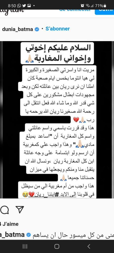 وأضافت: “قررت باسمي وباسم أسرتي أن أساعد بمبلغ مادي، وهذا واجب علي كمغربية أن أرسم ابتسامة على وجه عائلة ابن كل المغاربة ريان”.