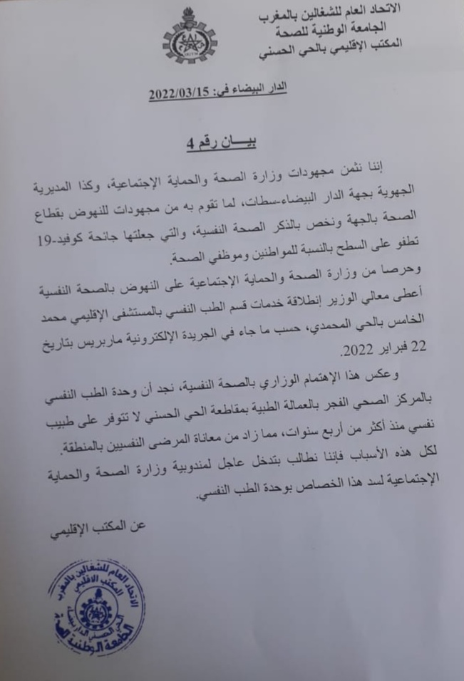 أصدر المكتب الإقليمي للجامعة الوطنية للصحة، التابع للاتحاد العام للشغالين بالمغرب(UGTM)، بيانا طالب فيه بتوفير طبيب نفسي، بالمركز الصحي الفجر، بالعمالة الطبية الحي الحسني.