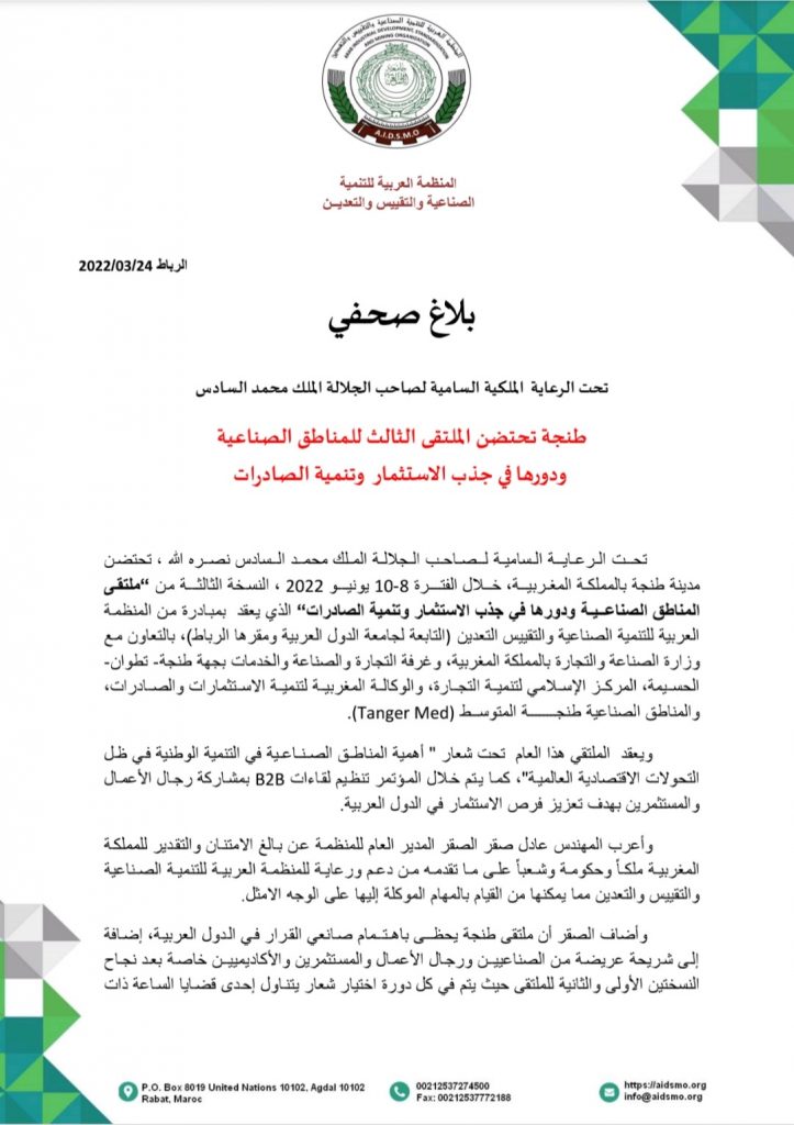 تحــت الـرعـايــة الـساميـة لــصـاحـب الـجلالـة المـلك محمـد الـسادس نصـره الله ، تحتضن مدينة طنجة بالمملكـة المغـربيــة، خــلال الفتـــرة 8-10 يونيــو 2022 ، النسخة الثالثــة من “ملتقى المناطق الصناعــيـة ودورها في جذب الاستثمار وتنمية الصادرات“ الذي يعقد بمبادرة من المنظمة العربية للتنمية الصناعية والتقييس التعدين) التابعة لجامعة الدول العربية ومقرها الرباط)، بالتعاون مع وزارة الصناعة والتجارة بالمملكة المغربية، وغرفة التجارة والصناعة والخدمات بجهة طنجة- تطوان- الحسيمة، المركز الإسلامي لتنمية التجارة، والوكالة المغربية لتنمية الاستثمارات والصادرات، والمناطق الصناعية طنجـــــــة المتوســط .(Tanger Med)