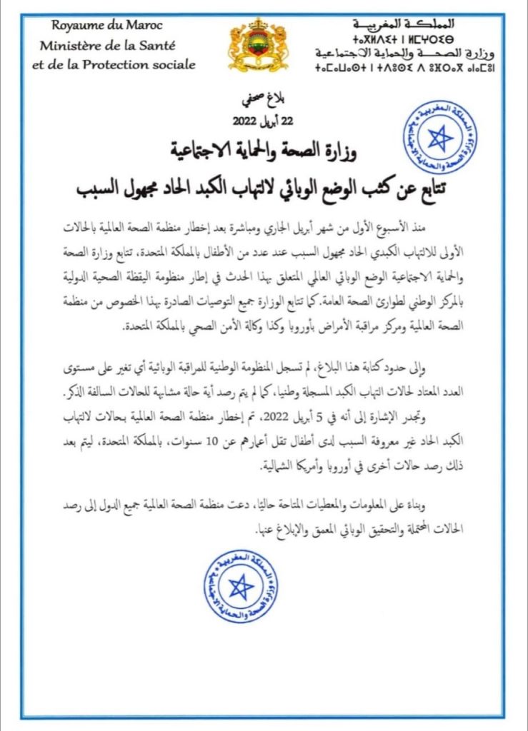 بعد إخطارها من طرف منظمة الصحة العالمية بالحالات الأولى للالتهاب الكبدي الحاد مجهول السبب عند عدد من الأطفال بالمملكة المتحدة منذ الأول من أبريل الجاري، ووزارة الصحة والحماية الاجتماعية تتابع عن كثب الوضع الوبائي العالمي في إطار منظومة اليقظة الصحية الدولية بالمركز الوطني لطوارئ الصحة العامة.