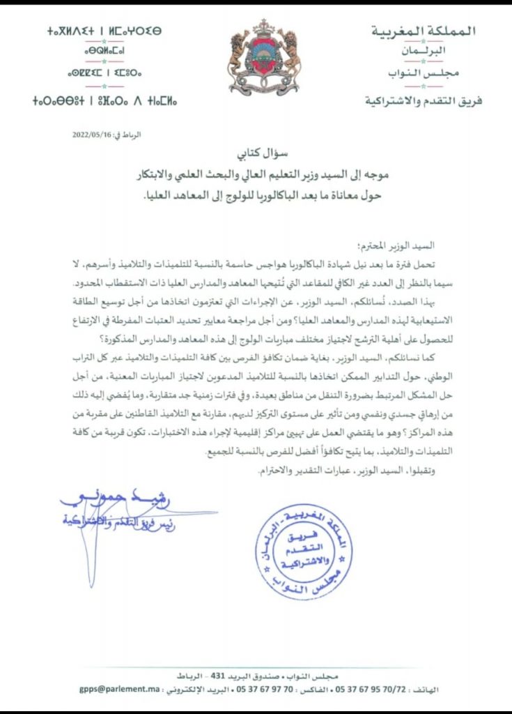 رشيد حموني يسائل وزير التعليم العالي والبحث العلمي والابتكار حول معاناة ما بعد الباكالوريا للولوج إلى المعاهد العليا