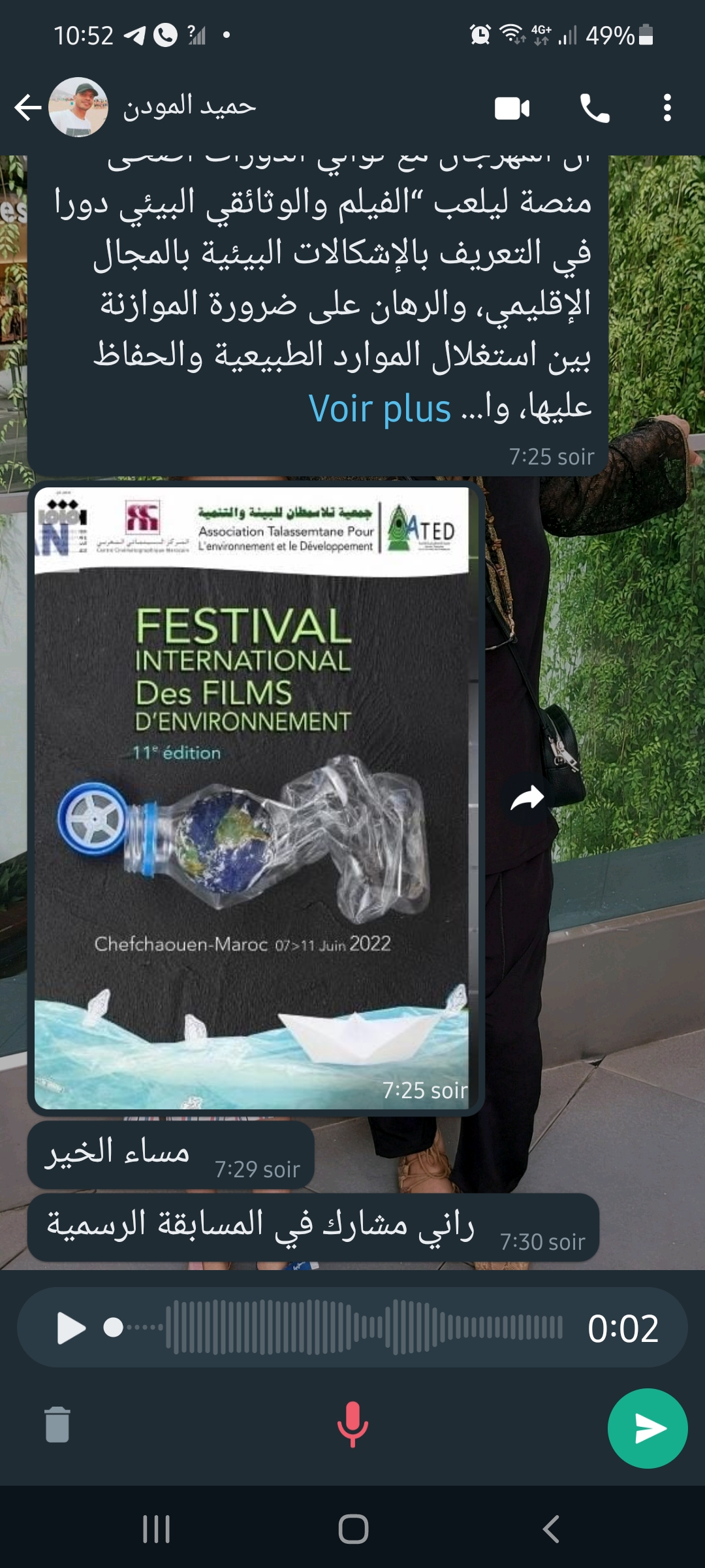 افتتحت مساء الثلاثاء 07 يونيو 2022 بمسرح القصبة الأثرية بشفشاون فعاليات المهرجان الدولي الحادي عشر لأفلام البيئة، الذي تنظمه جمعية تلاسمطان للبيئة والتنمية تحت شعار “صفر بلاستيك”.