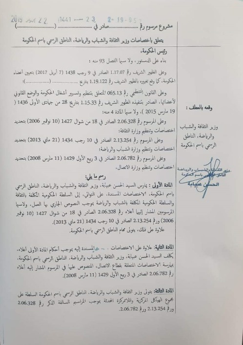أعلن المرسوم الذي أصدره رئيس الحكومة، سعد الدين العثماني، أن وزارة الاتصال أصبحت رسميا من صلاحيات وزير الثقافة والشباب والرياضة، الحسن عيبابة.