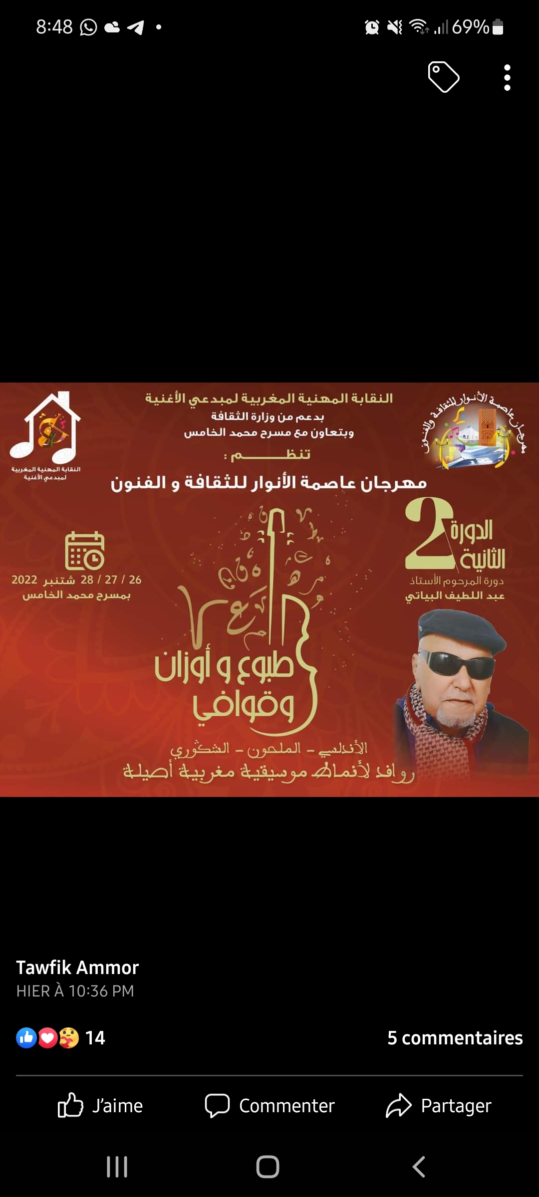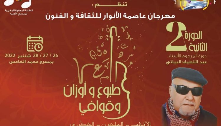 تحت شعار “طبوع، أوزان وقوافي”؛ تعتزم النقابة المهنية المغربية لمبدعي الأغنية، ويدعم من وزارة الثقافة وبتعاون مع مسرح محمد الخامس، تنظيم النسخة الثانية لمهرجان عاصمة الأنوار، دورة المرحوم الأستاذ عبد اللطيف البياتي وذلك ايام 26-27-28 شتنبر الحالي.