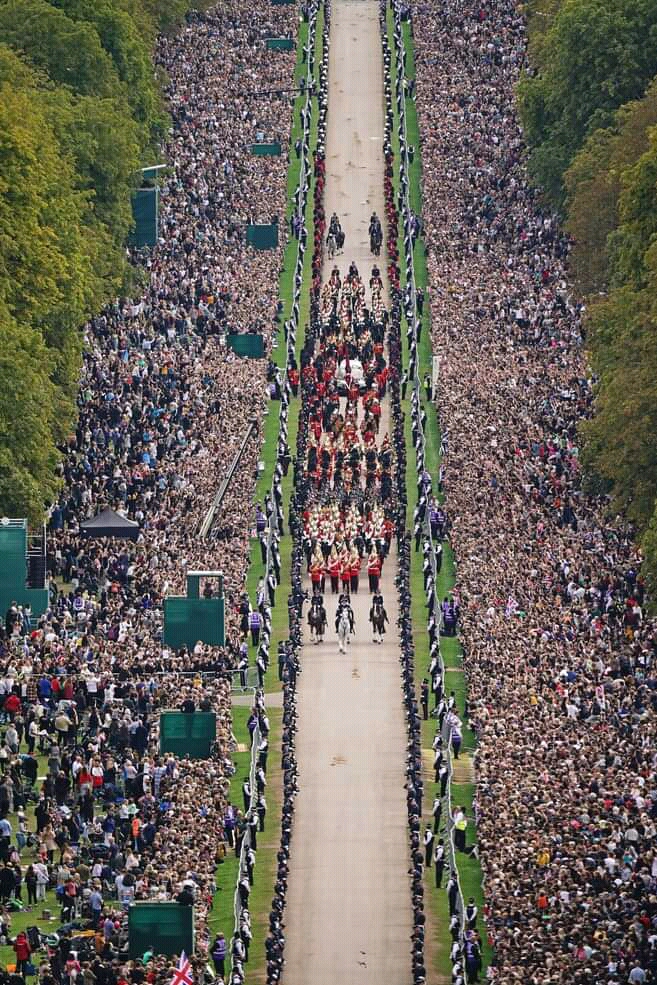 وكان الآلاف من الأشخاص يسيرون على الطريق البالغ طوله 35 كيلومترا من لندن إلى وندسور في غرب العاصمة، جاءوا من كل مكان لتوديع ملكتهم بالكثير من المحبة، حيث وصفوها بملكة القلوب التي خدمت شعبها على مدار سبعين عاما وهي المدة الأطول في تاريخ الدول الحديثة ذات الأنظمة الملكية، لتدخل بذلك الملكة اليزابيث الثانية التاريخ من أوسع أبوابه، وتبدأ بذلك بريطانيا عهدا جديدا مع ابنها الملك تشارلز الثالث الذي ورث العرش وهو في سن 75 عاما.