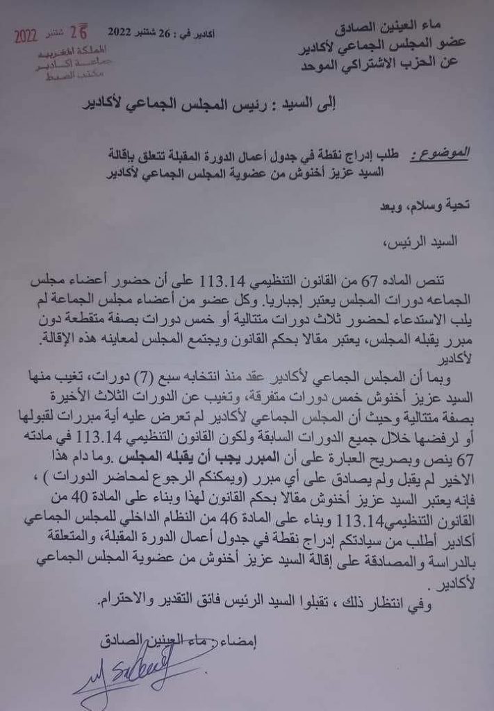 حيث جاء في مراسلة تحصل موقع دنابريس على نسخة منها؛ موجهة إلى رئاسة المجلس، من أجل إدراج نقطة في جدول أعمال الدورة المقبلة تتعلق بإقالة عزيز أخنوش من عضوية المجلس الجماعي لأكادير.