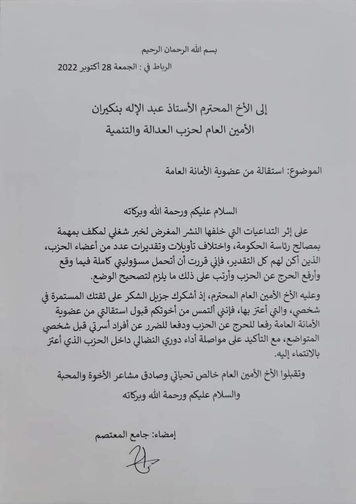 واكد المعتصم في رسالة استقالته، والتي تناقلتها مصادر اعلامية: “على إثر التداعيات المغرضة التي خلفها النشر المغرض لخبر شغلي لمكلف بمهمة لمصالح رئاسة الحكومة، واختلاف تأويلات وتقديرات عدد من أعضاء الحزب، الذين أكن لهم كل التقدير، فإني قررت أن أتحمل مسؤوليتي كاملة فيما وقع، وأرفع الحرج عن الحزب وارتب على ذلك ما يلزم لتصحيح الوضع”.