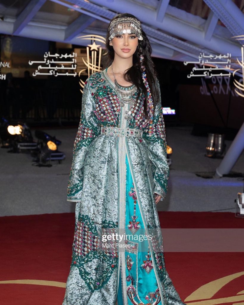 بقفطان تقليدي بحت من تصميم المصممة العالمية فاطمة الزهراء الادريسي، والمستوحى من الثقافة الأمازيغية المغربية، مصنوع من يد المعلم ومطىز بخيوط من الحرير الفضي، مزين بالأحجار الكريمة والخرز المرجاني ذي الجمال الرقيق، ويمتزج بمهارة مع الأنماط والألوان البربرية.