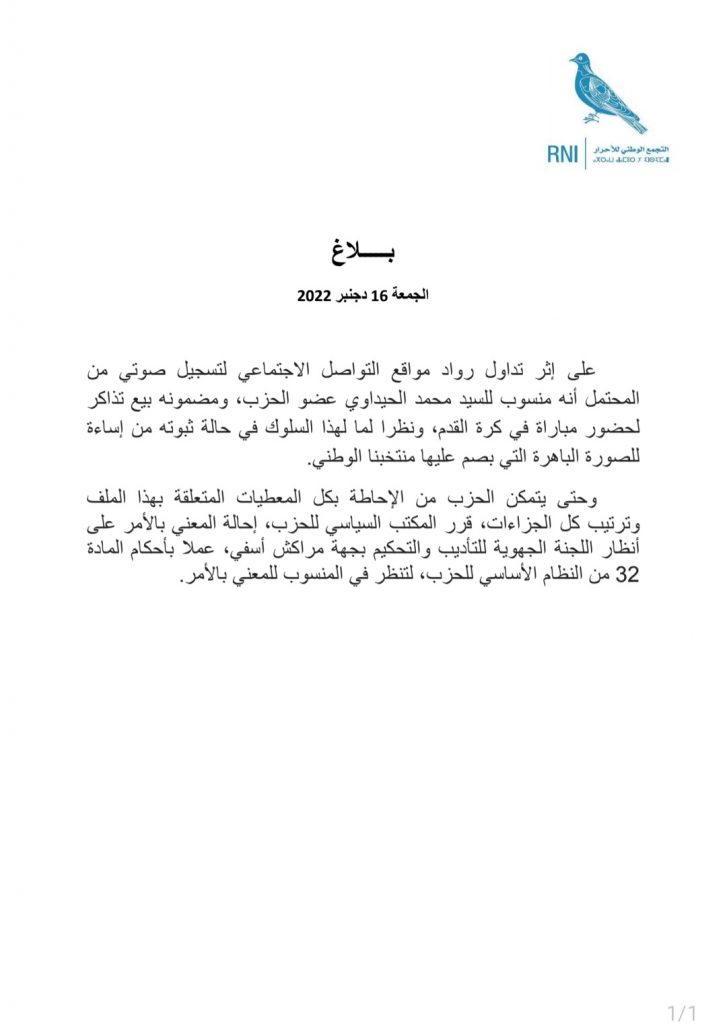 فحسب بلاغ توصل به موقع دنا بريس يفيد: “على إثر تداول رواد مواقع التواصل الاجتماعي لتسجيل صوتي من المحتمل أنه منسوب للسيد محمد الحيداوي عضو الحزب، ومضمونه بيع تذاكر لحضور مباراة في كرة القدم”.